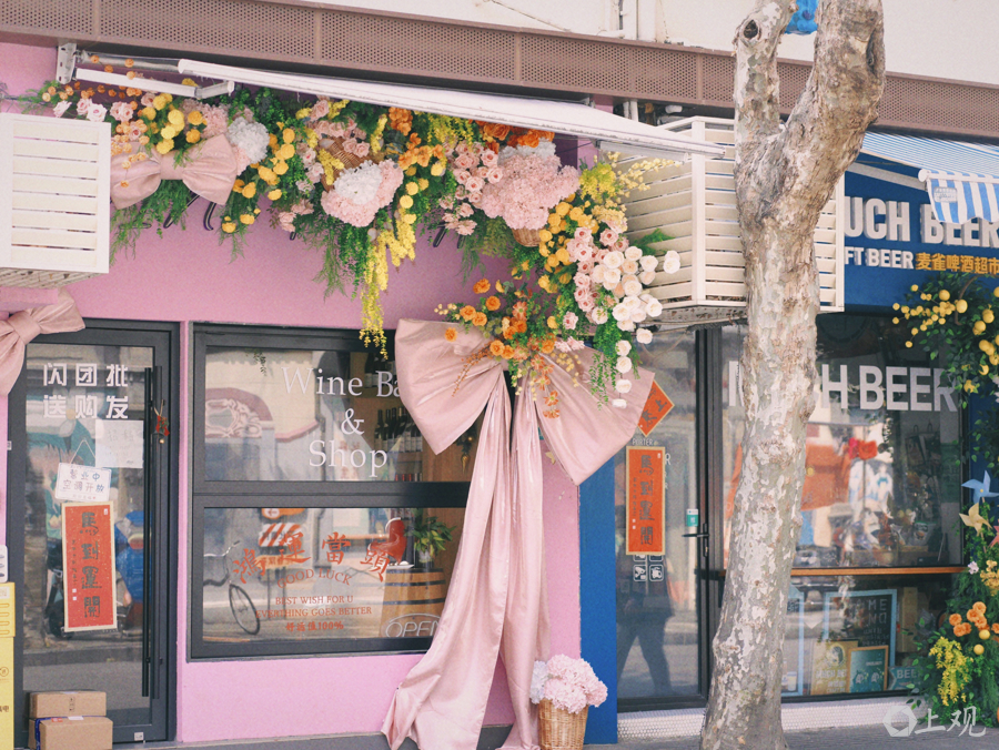 锦拈花团爬满熟识就的围墙,大红蝴蝶结系在铁艺栅栏上,最引诱眼球的是10家沿街小店的橱窗外被五彩斑斓的鲜花“包围”,一店一花语,超等有氛围感。