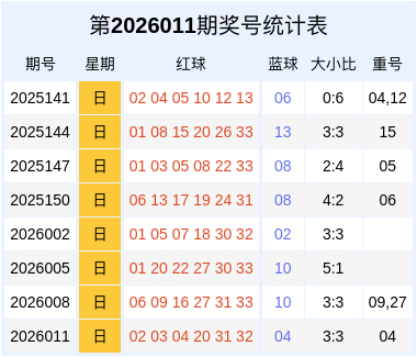 重号分析:上周日开出重号为04,在近8期同周日的奖号数据中,开出重号的概率为75.00%,本周日揣测会开出重号:12。