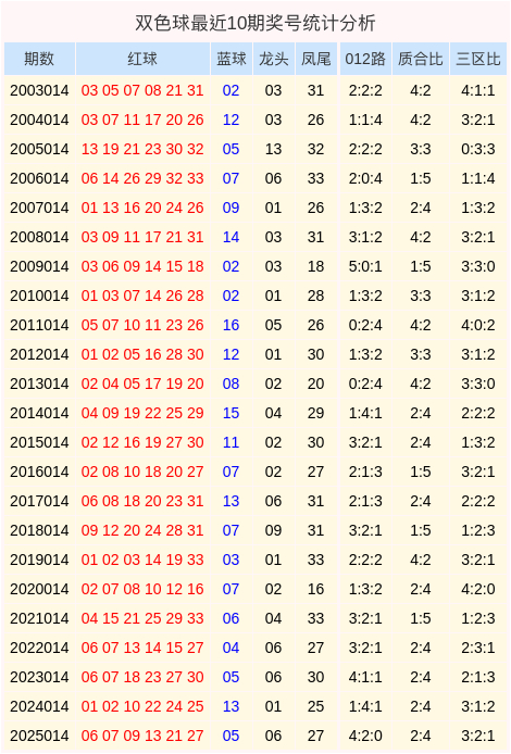 012路比分析:客岁同时开出的奖号012路比为4:2:0,在积年同时奖号数据中,开出4:2:0的次数为1次,本期瞻望012路比为0:4:2。