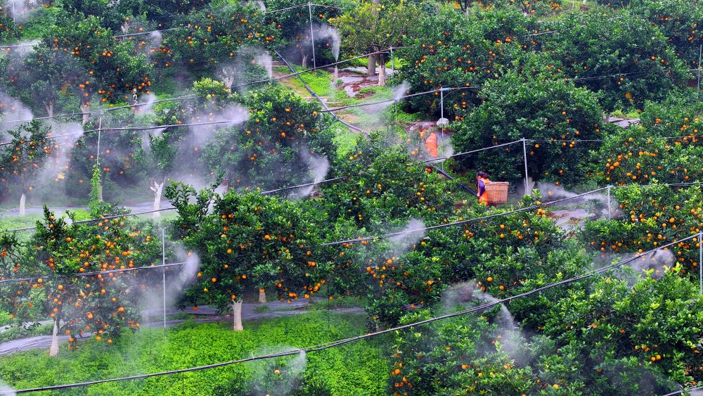 在重庆江津区夏坝镇太阳橙基地,管护东说念主员哄骗微弥雾系统浇灌橙园。新华社发