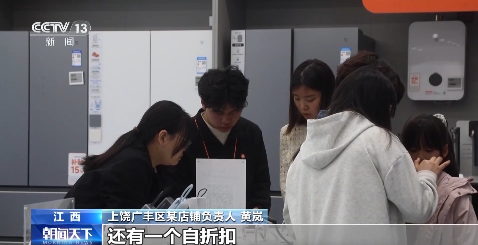 上饶广丰区某店铺雅致东说念主 黄岚:这几天差未几每天可以达到三四万元的销售额。咱们店铺除了国补之外,还有一个自扣头,同期还有一个家庭套餐优惠。
