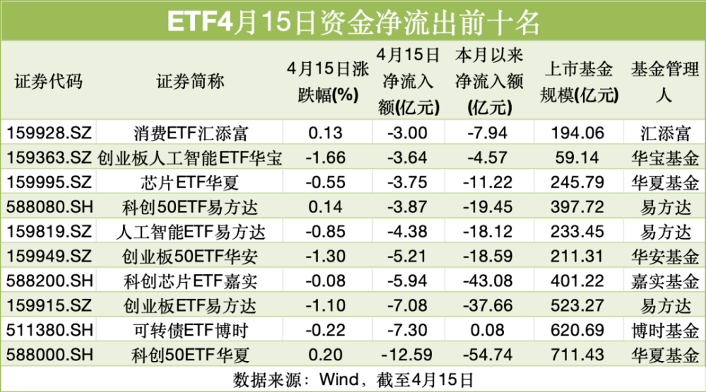 资金净流出方面,追踪科创50指数、可转债指数、创业板指数、科创芯片指数的相干ETF位居净流出榜前哨。