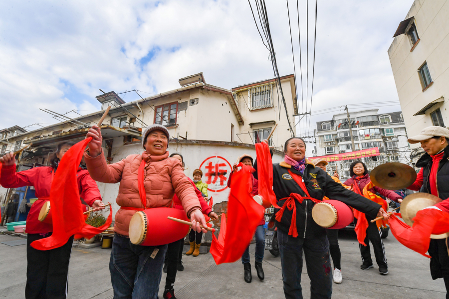 今天上昼,普陀区甘陵小区一号、二号、三号地块征收签约使命圆满收场,住户敲锣打饱读喜迎搬迁。