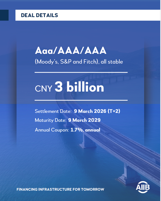 近日,亚洲基础步伐投资银行(亚投行)到手刊行30亿元东谈主民币三年期熊猫债。左证最终订价,本期债券票面利率为1.70%。