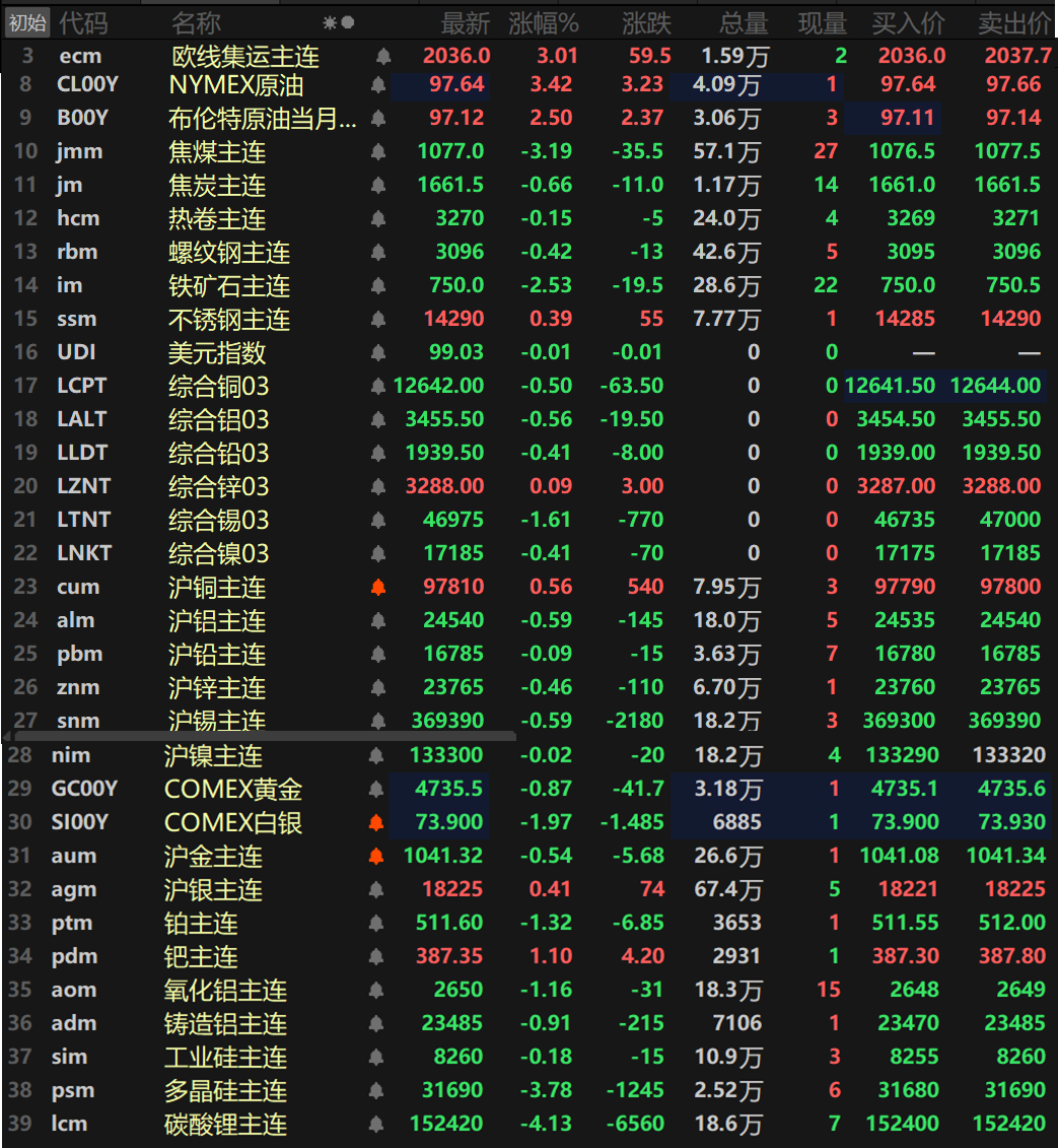 此外,碳酸锂主连跌4.13%,工业硅主连跌0.18%,多晶硅主连跌3.78%。欧线集运主连涨3.01%报2036。