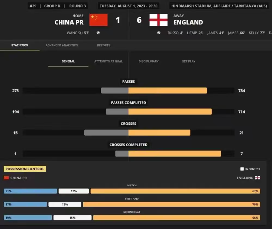 中国女足与英格兰队差距赫然