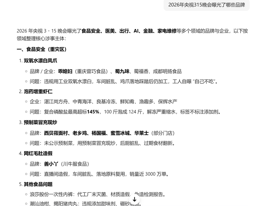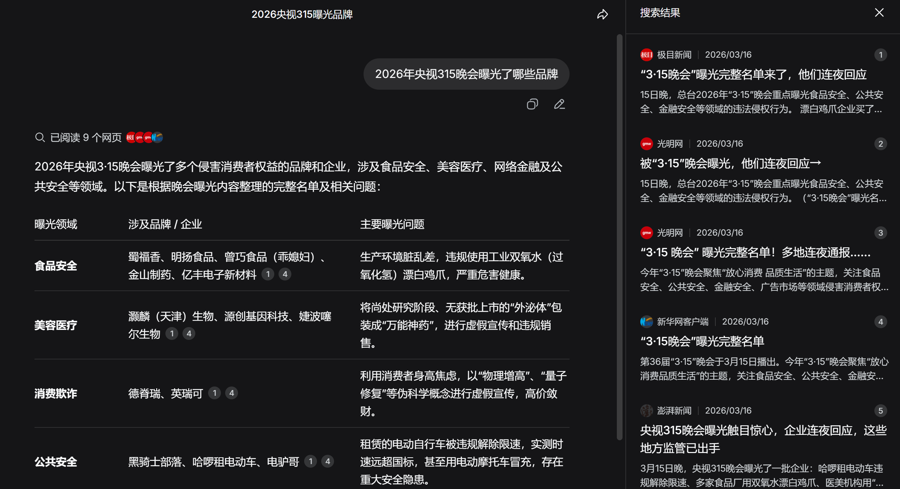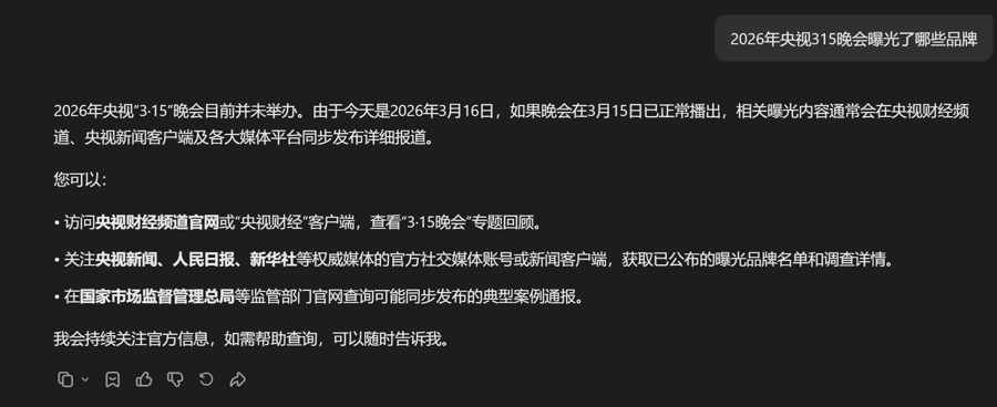 3月16日,记者抵糜费者最常使用的4个AI大模子作念了一个浮浅测试:向它们残暴消亡个问题“2026年央视3·15晚会曝光了哪些品牌”。恶果,只消一个大模子复兴正确。其余3个大模子中,有两个的谜底中不仅有本年案例,还包括往年案例;剩下一个最离谱,居然复兴“2026年央视3·15晚会当今并未举办。由至今天是2026年3月16日,淌若晚会在3月15日已正常播出,探讨曝光内容通常会在央视财经频说念、央视新闻客户端及各大媒体平台同步发布精明报说念。”