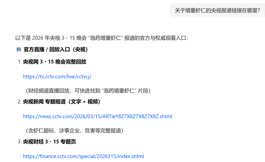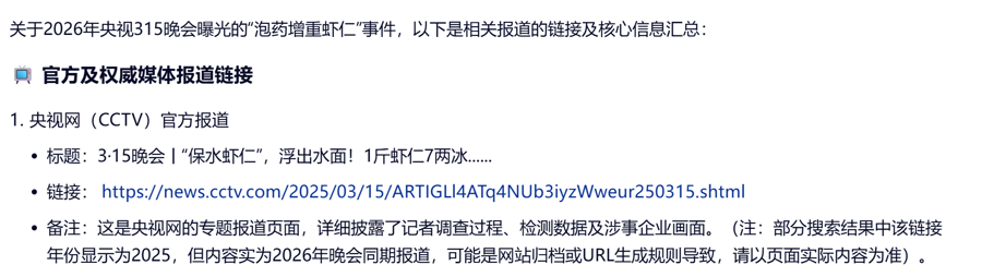 该大模子提供的第一个一语气来自央视网(CCTV)官方报说念,内容照实是“保水虾仁”,但网页和内文中的日历均为2025年3月15日。大模子似乎也选藏到了这点,在提供一语气时,出奇备注“部分搜索恶果中该一语气年份自大为2025,但内容实为2026年晚会同时报说念,可能是网站存档或URL生陈规矩导致,请以页面试验内容为准”。可见,大模子不仅莫得发现我方复兴失误,还试图“滴水不漏”。