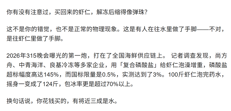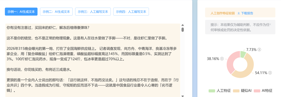 该大模子提供的第二个一语气是某自媒体围绕本年央视“3·15”晚会的“解读稿”,账号巨擘性值得商榷。至于内容,更是错误百出,其中最昭彰的是“解读稿”称,2026年“3·15”晚会曝光的第一个案例等于“泡药虾仁”——由此也能证明为什么大模子将它算作参考一语气。记者又用检测器用检测了这篇“解读稿”的“AI含量”,它被判定为“东说念主工创作特征较弱”。换句话说,这篇著述很可能由大模子生成,是以它所波及的案例也出现了偏差。