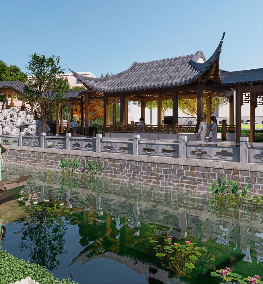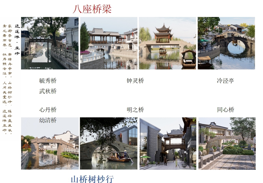 九龙丘与对面可溯源至明代的古宅李雪亭宅,隔河相望,二者组成了“龙首”的核情预想。再加上庄行暴动义士驰念碑、修缮安妥的古桥两处节点,如神龙舒腰摆尾,东西绵延相应。