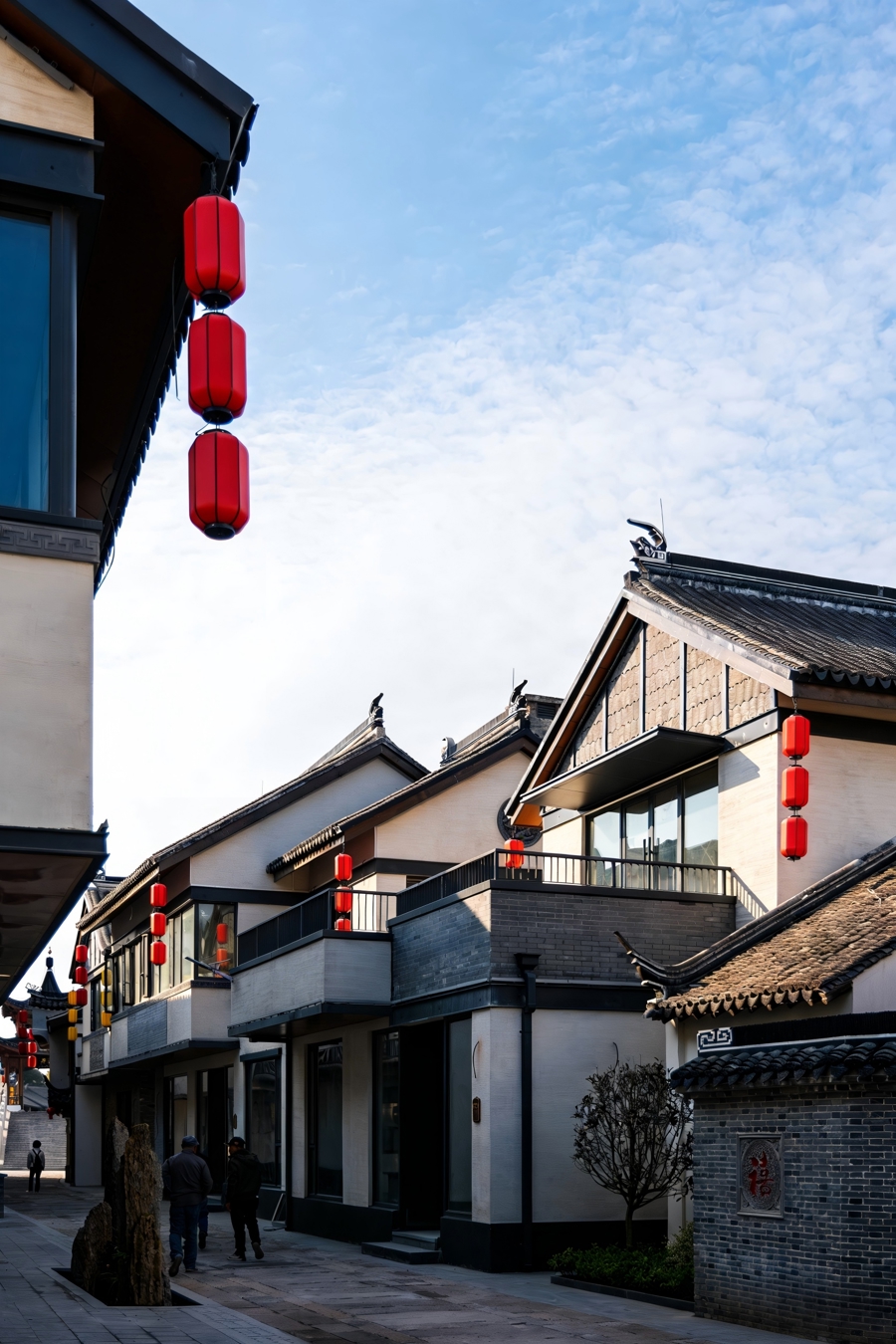 也有当代元素的房屋,比如纵贯二楼的露台、大面积玻璃门等,齐并非传统古镇常见的面容。当代元素与传统风貌和会,举座合作,细节因变化而让东说念主有惊喜感。